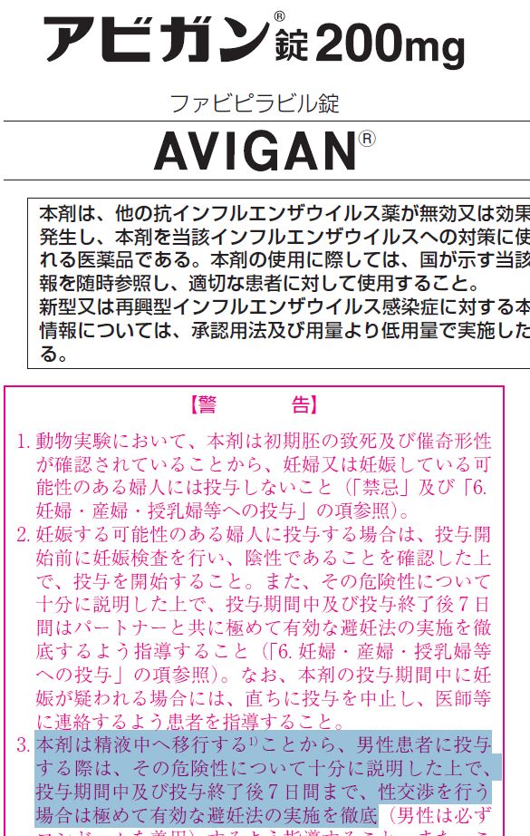 ちなみに実はアビガンは男性の妊活も禁忌です。それは体内で薬が精液移行するからで、
